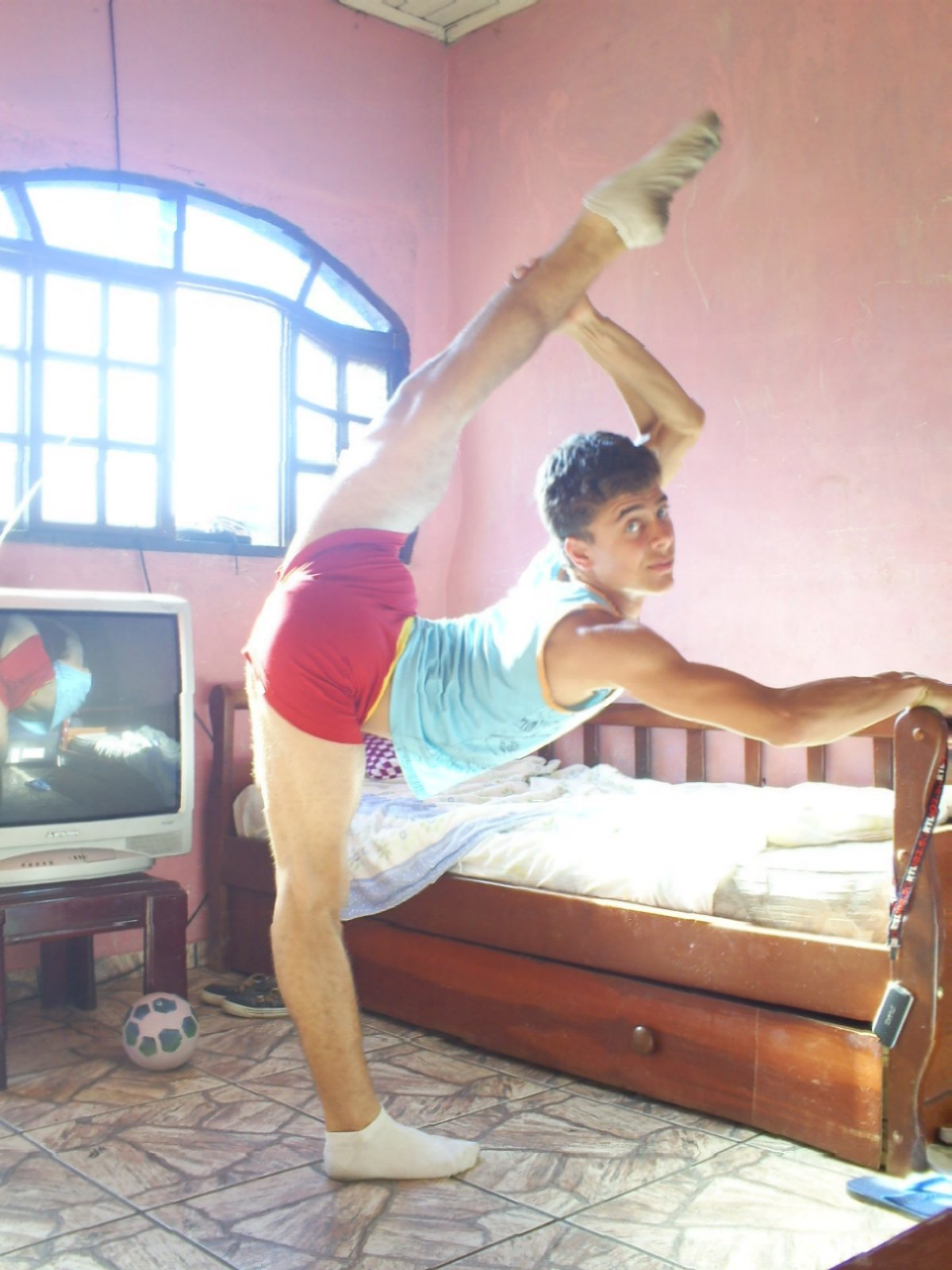 It’s 2 am… here’s one ballet reblog before I go to bed. Nice example of hyper-flexibility here. His facial expression makes this photo though, “Yep, this is something I can do and you can’t.” Also check out the reflection of his belly and curve of his body in the TV screen. Mm.