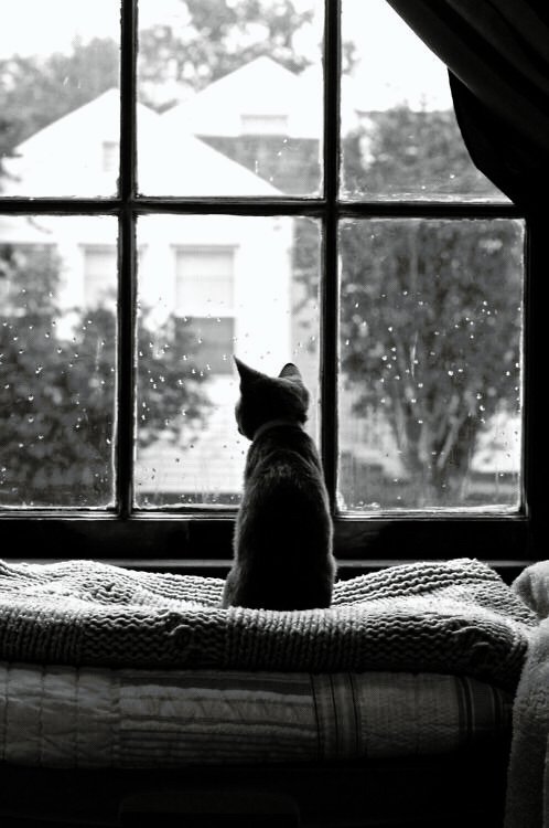 The kitten mewls. “What is it?” I ask, looking up. Every time a droplet hits the window, her eyes dart to it. She looks silly, and I giggle. I scoop her up and cuddle her. “Your first rain huh?’