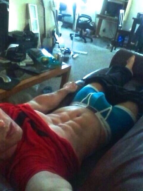 I console my inferiority by cupping my hand and running my palm over the swell of his calves. “Mmmmmmm,” Lambert purrs under me. The touch slides up his thigh and slows as it crests over the sculpted muscle of his butt. As my hand moves up his leg, he arches up into my touch like a rather hedonistic housecat. I guide my hand backwards and down his elevated hips, between his legs and stroke his bulge firmly trapped in tight underwear. Lamber groans and buries his face in the pillow. “John, Johnny not – now, please, I am very sensitive and must wait to be horny after practice.”