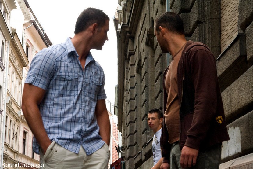 Here we see a momentary exchange in where the balance of power is obvious to everyone, but each is waiting for the other to act on it. The two in the foreground have spotted an untrained faggot in the wild, who is distracted with the presence of two real men. These two know these types of boys are safer off the streets and into proper care. The kind with ropes, and chastity devices.