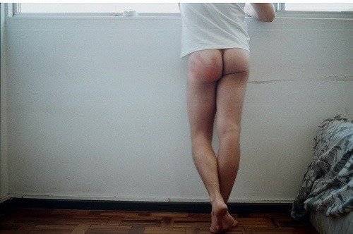 “Sounds great,” He says with a smile. You nod and smack his ass and slide out of bed. You go to the kitchen, get a drink, and kick the door to the fridge shut with your foot. When you come back in the bedroom, you pause in the doorframe to appreciate the view. He’s standing there, pantsless, in front of the window. The outline of your hand is clear as day on his peach ass. You grin.