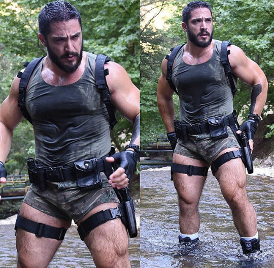 Will furrows his brow as he thinks about this. Tight shorts. Bulge. Big ol ‘bulge. And Bare legs. Bare thighs. Stomper boots. Tight tank showing off the pecs… guns…gun harnesses….
