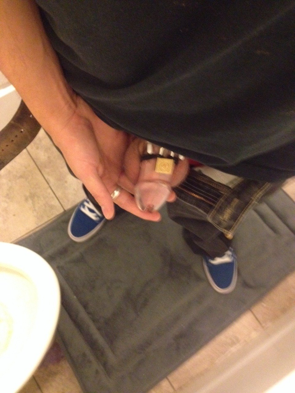Mmm my first reaction would be to say that the Sir on the left put his boy’s little nub in protection for his own safety, and that he wanted to have a picture for him to commemorate the day it became permanent. However, I noticed that the erect boy is shaved too so maybe he’s not the Sir, but another sub. Perhaps this photo was taken by their keyholder as a comparison shot to show to other Sirs who are thinking of doing the same thing. Or maybe…I got it, it’s a photo to show the two states of male slaves available at a popular BDSM club. Either way, I’m willing to bet that the locked boy dropped to his knees afterwards and serviced that erection until someone pulled him off of it.