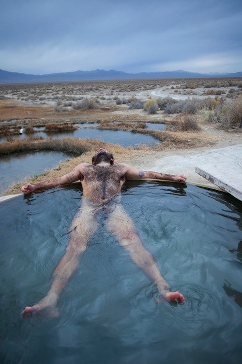 He smiles, then walks around to the side and slips into the pool. He gasps as the cold water shocks his nervous system.