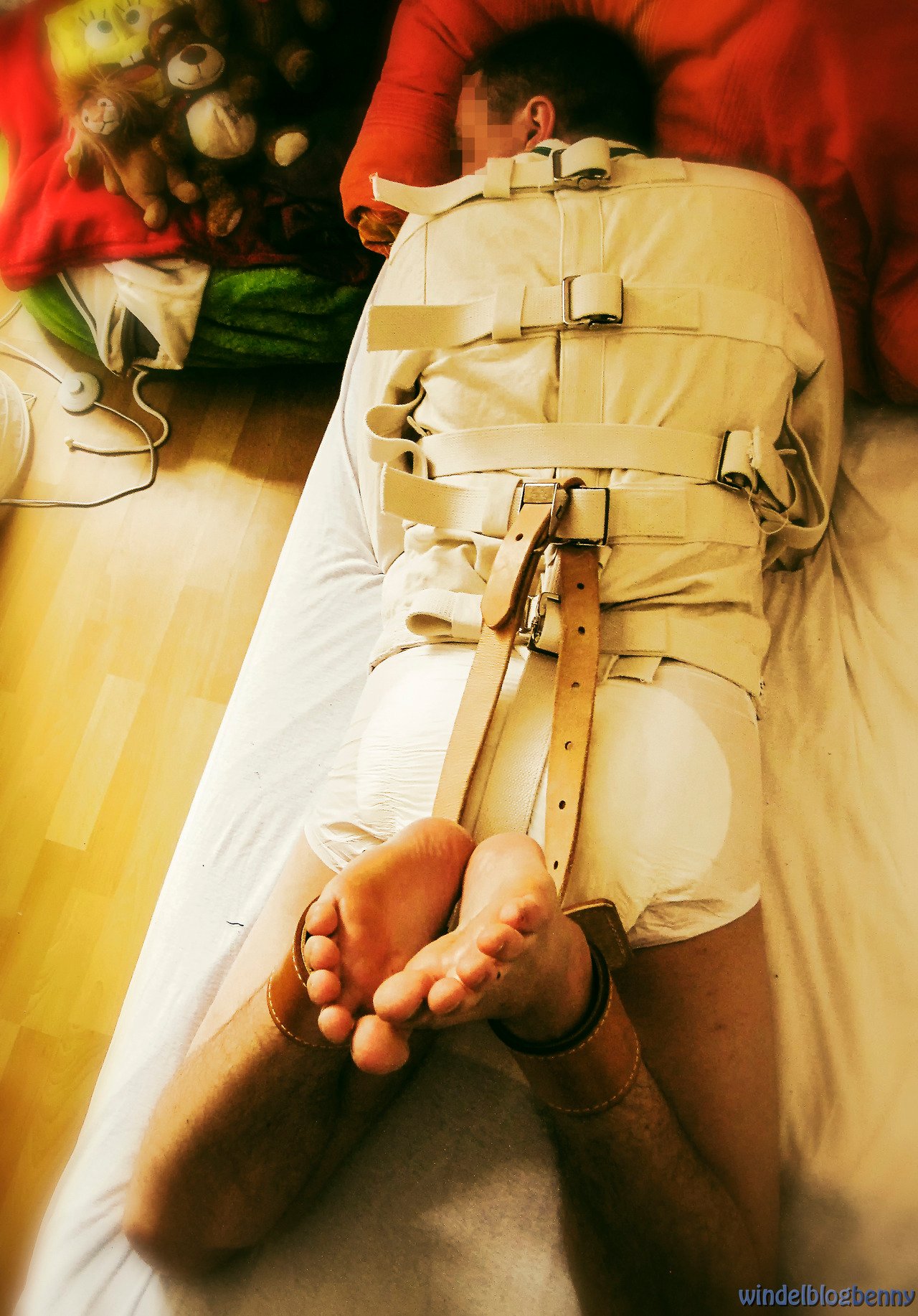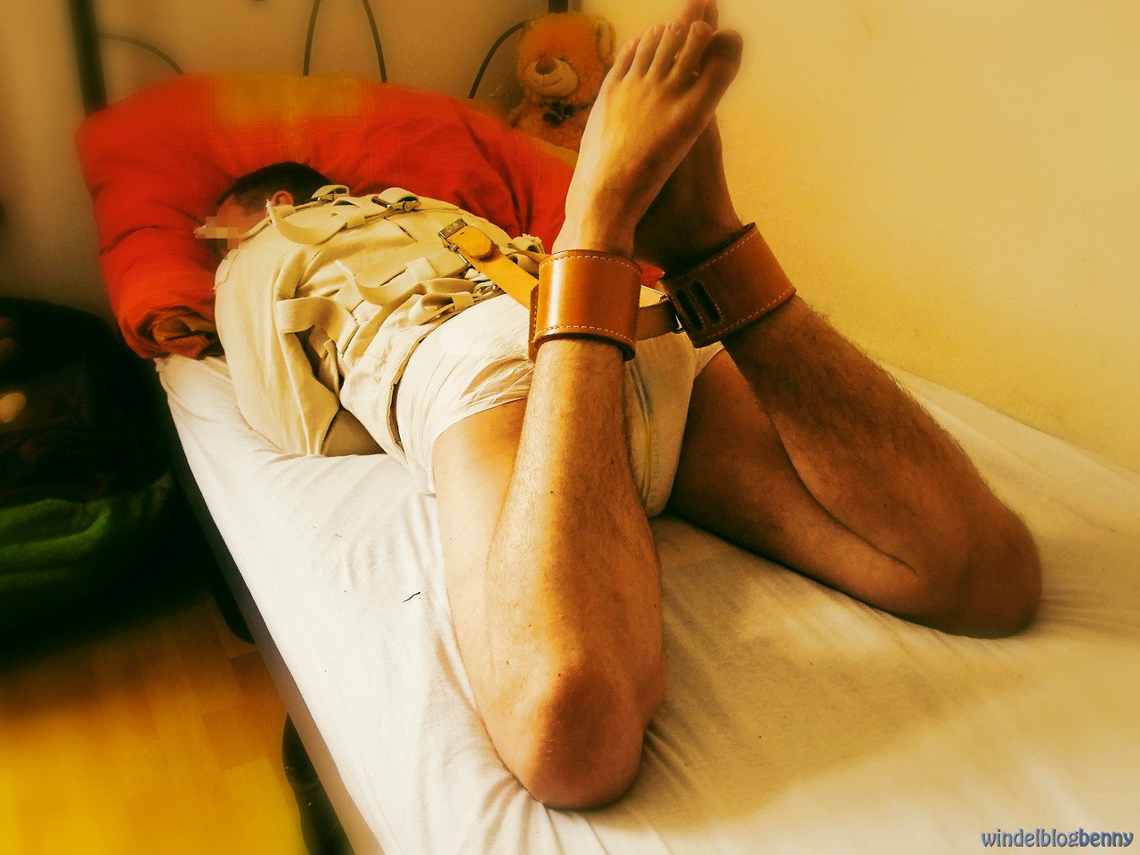 When it was time for bed, he took me up to his guest room and showed me where I’d be sleeping. I balked at the idea of wearing what was obviously an adult diaper but he basically said it was that or wet the bed if I had to go. At this point, I was so desperate to get a good nights rest that I just gave in, self respect be damned. He was a patient man, and explained step by step what he was doing as he tied my straps. To my shock, the more immobile I became the more my cock began to stiffen. I hadn’t been able to rouse it since I returned from the Middle East. I was a bit relieved Mick couldn’t see it as I was on my stomach and in so much padding.